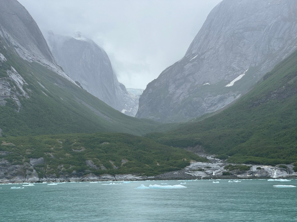 The landscape of the Inland Passage—it’s all about glaciers. Ice rivers thousands of years old, cutting through mountains, grinding them into boulders and ultimately sand and silt, scraping it all along its path, melting, freezing, dragging more rocks and mud, flowing inexorably downhill until they melt, then continue to flow to the sea. Ice fields farther inland feed the glaciers.