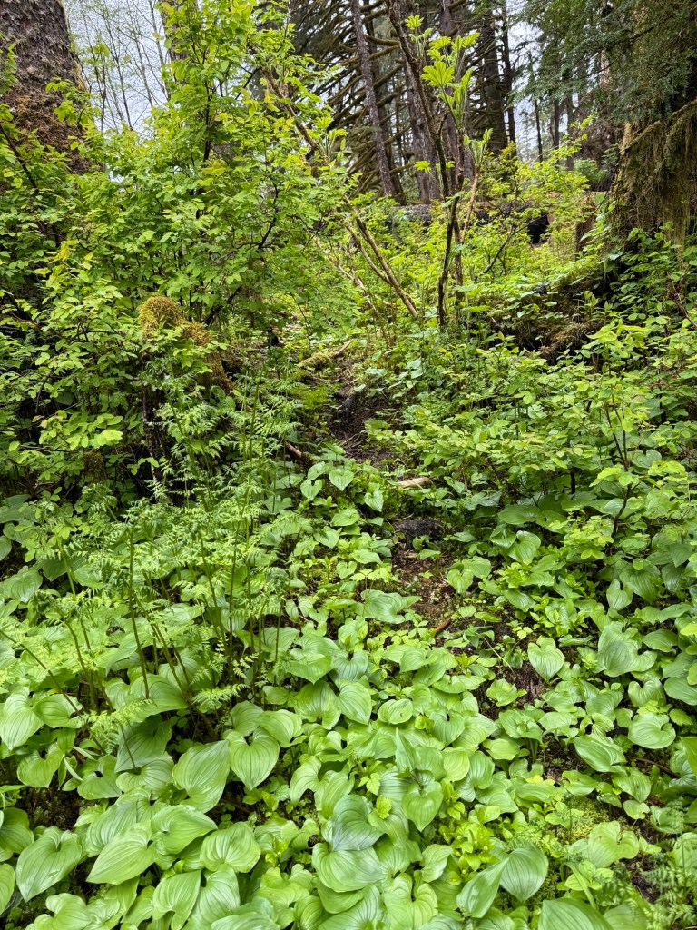 After hundreds of years, a dense rain forest evolves, its floor a thick, soft carpet of moss that covers tree roots and fallen logs. Deer cabbage, skunk cabbage, salmon berries, devil’s club, and a host of other plants take root.