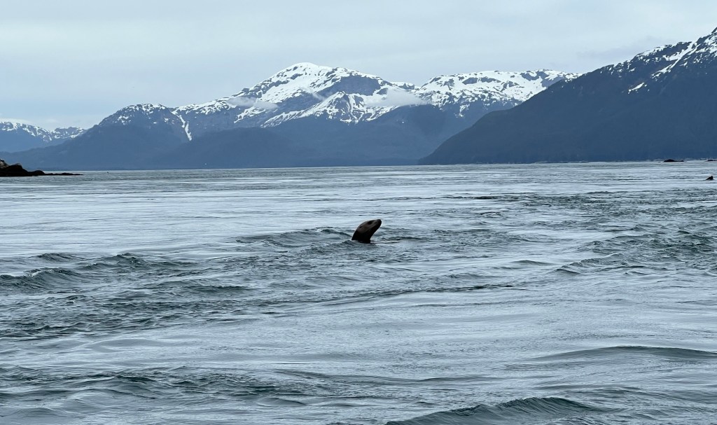 When I opened the curtains of our cabin at 6am, I noticed a little bubble on the calm surface of the water, then a good-sized fish jumped and re-entered the water about 8 feet away. A salmon, a naturalist told me later. Going to be another good day…