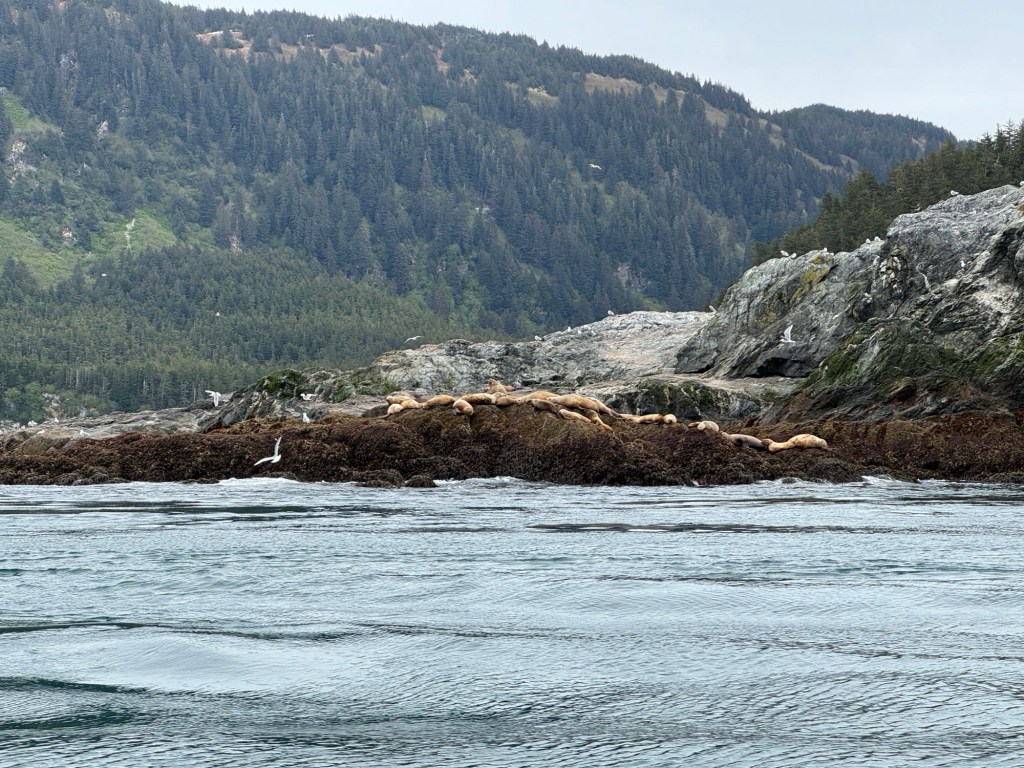 We saw countless bald eagles. It’s awfully hard to video birds in flight from a moving boat. We saw an adult dive for a fish and a youngster (likely offspring) try to take it away, causing it to drop. Only caught a few seconds.