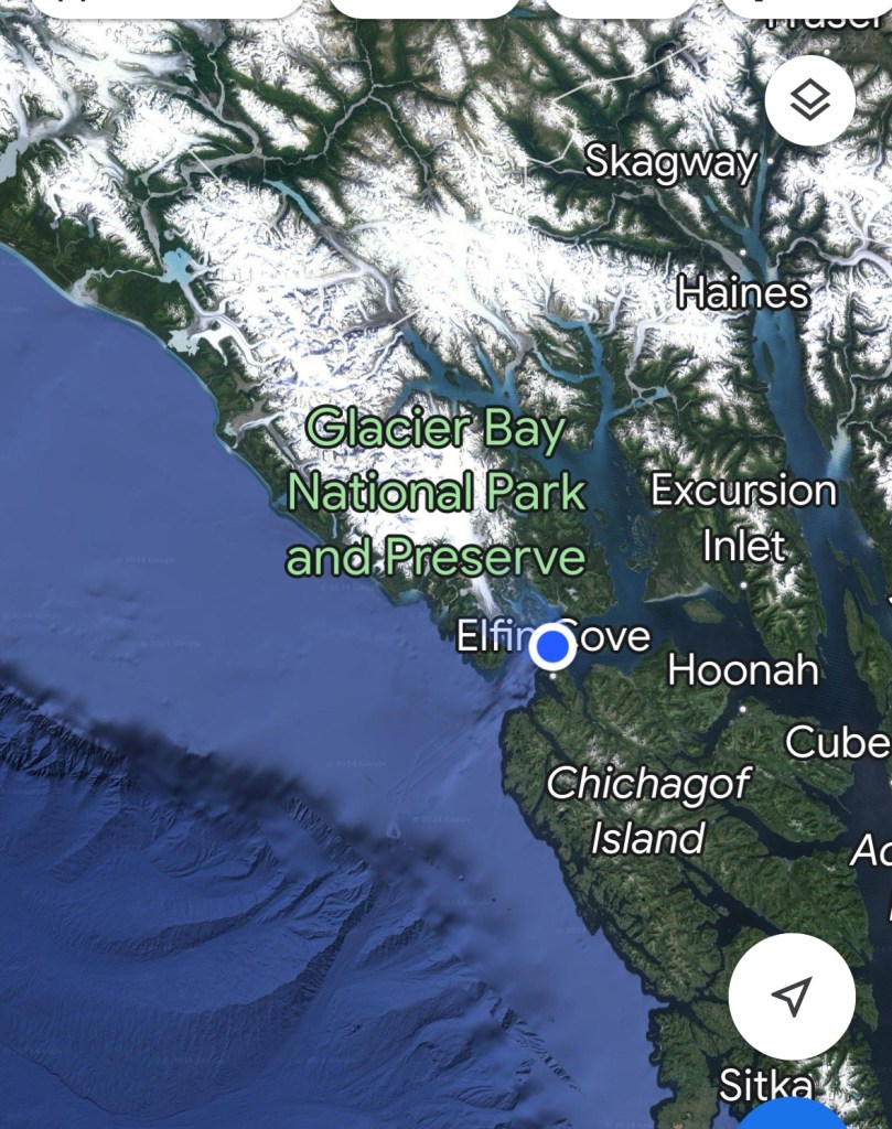 The blue dot on the left map shows we’re near the mouth of the northernmost narrows where the Inland Passage meets the open Pacific.