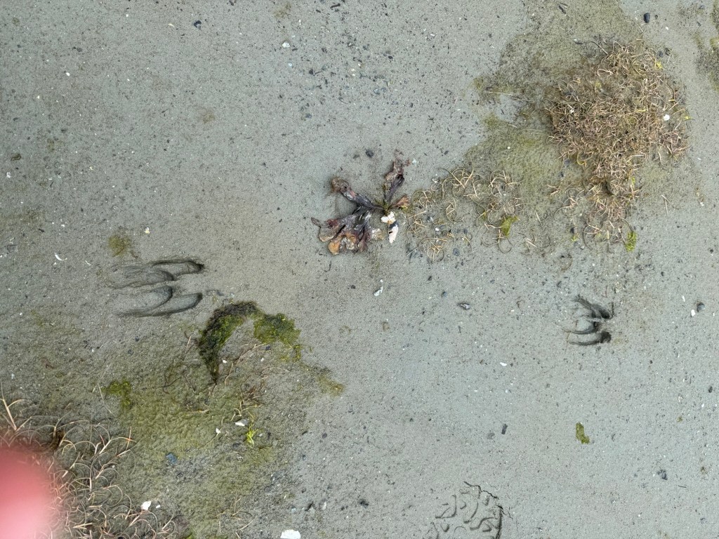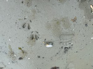 Black tail deer roam this area also. The same tidal flat revealed tracks of a buck (left) and a doe (right).