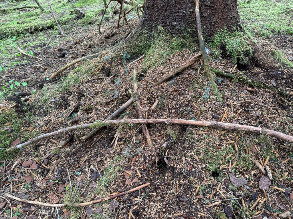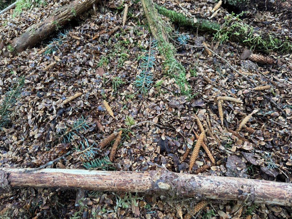The bases of many conifers are piled high with stripped cores and scales of tiny cones. We never saw the red squirrels that picked the seeds out of them; they are shyer than the gray squirrels and chipmunks that were our neighbors in the fir forests of California.