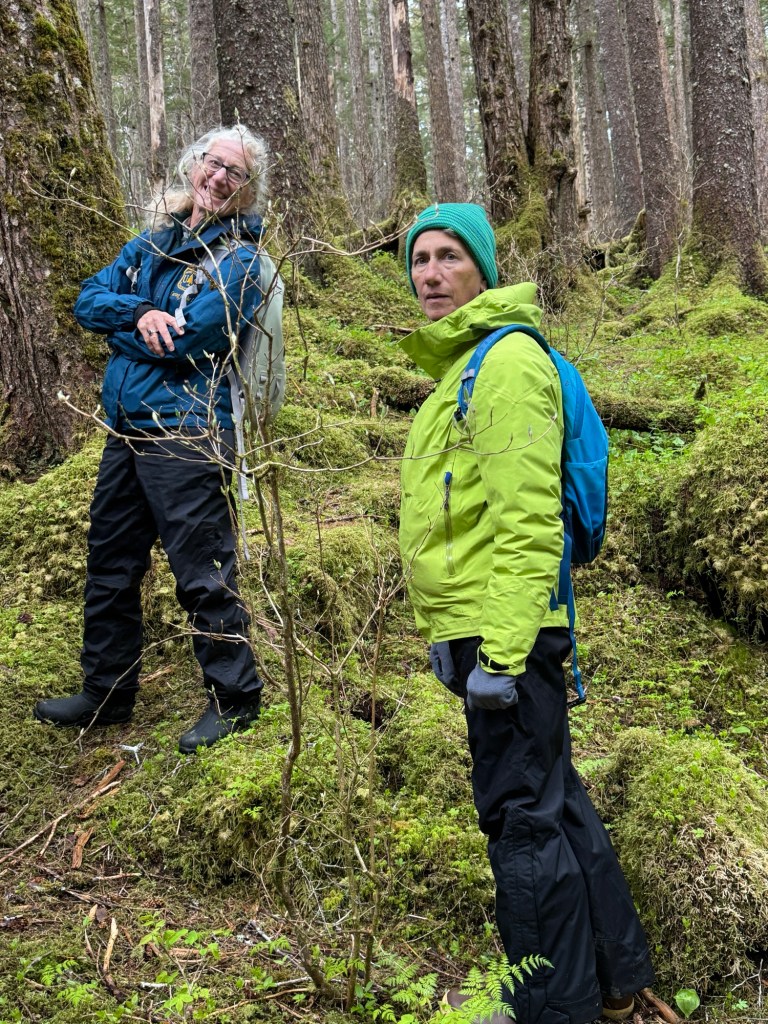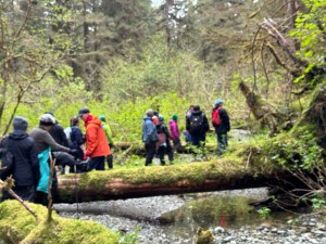 A creek bed opened up a route from the tidal flats into the forest. Soon, fallen logs and thickets of devil’s club* blocked our way.