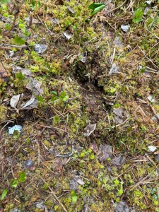 When we left the tidal flats and turned into the forest, we saw more scat. Dozens of piles of deer droppings and occasional bear scat. Below, there is a small chunk of bear scat (top of photo) next to a scattering of deer pellets.