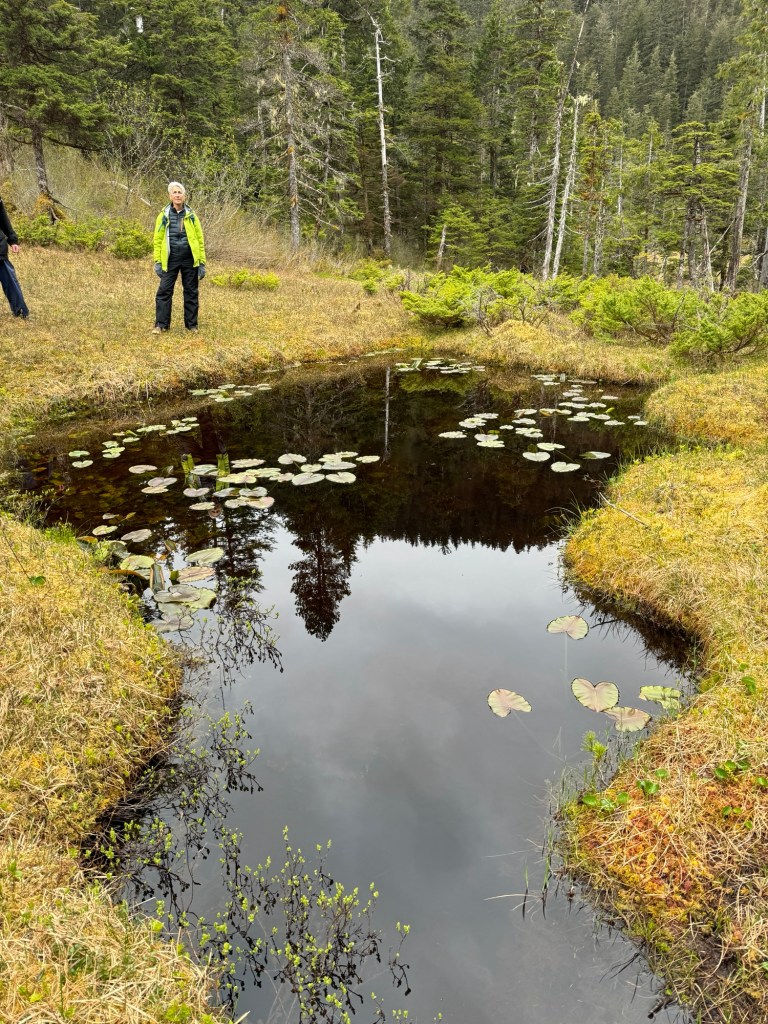 With a lot of effort clambering over and around mossy roots and boulders—easy trail for bear and deer, not so much for human tourists—we topped a small ridge. Below us was a small boggy meadow, a miniature muskeg.*