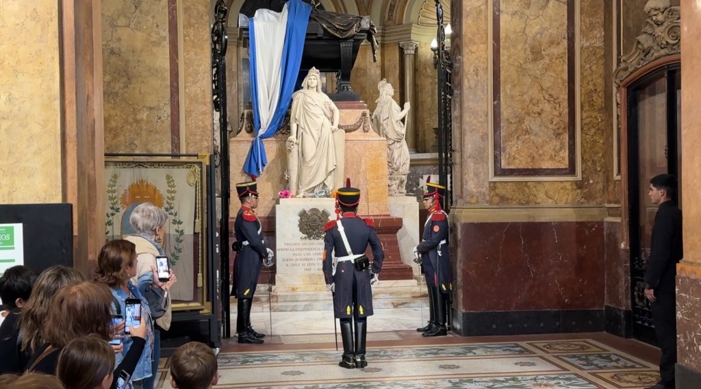 Jose de San Martin is known as the Liberator in Argentina, Chile, and Peru. In the US, we have the story of George Washington crossing the Potomac; San Martin is famous for crossing the Andes. His remains lie in a sarcophagus in the main church, protected by two soldiers.